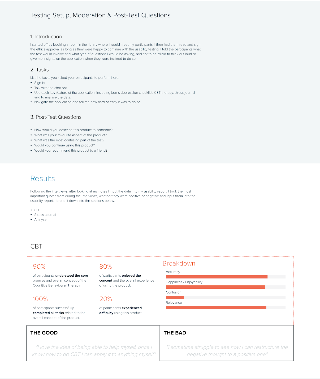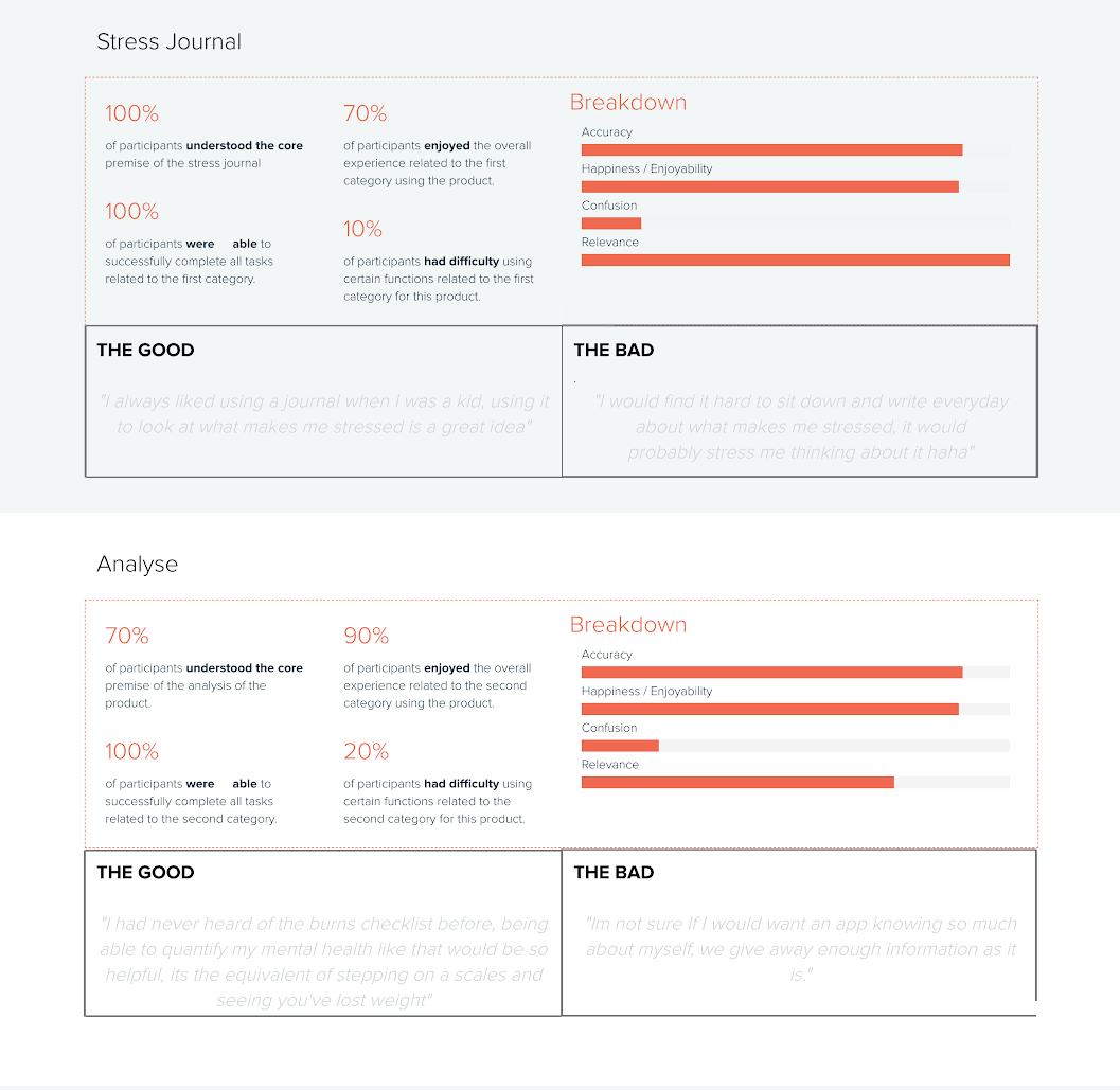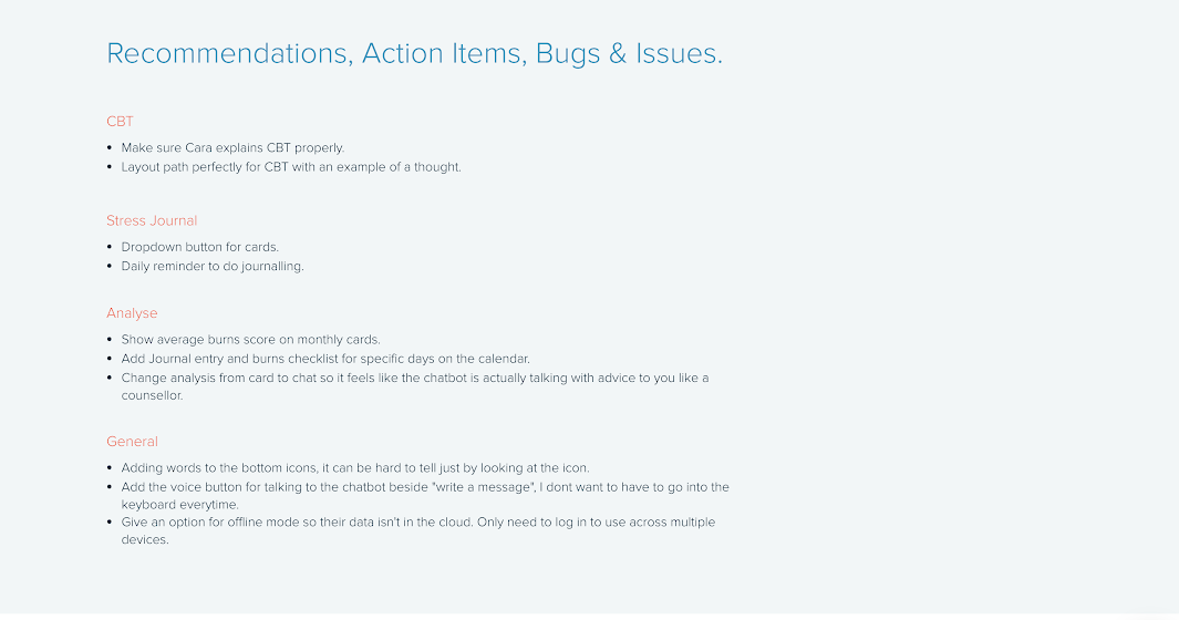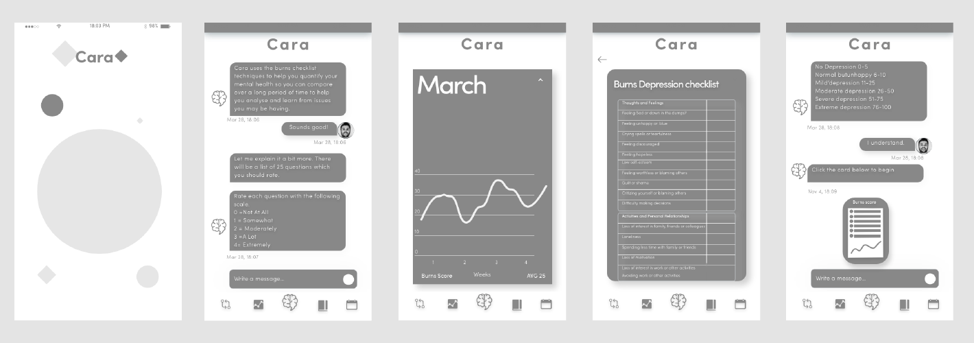 The basic premise of the artificial intelligence chatbot would be that it would allow the user to chat to the AI about managing their mental health on an ongoing basis and learn how to cope with clinically proven techniques. The three main techniques are the burns depression checklist used to quantify the users levels of depression and track it, a stress journal to identify your stressors everyday and finally CBT to help provide a therapy to teach the user to restructure their harmful thoughts. Then once a certain amount of data is gathered the artificial intelligence could anaylze the data and give feedback and pointers about the users behaviours. These features were chosen after heavy research through reading peer reviewed papers.